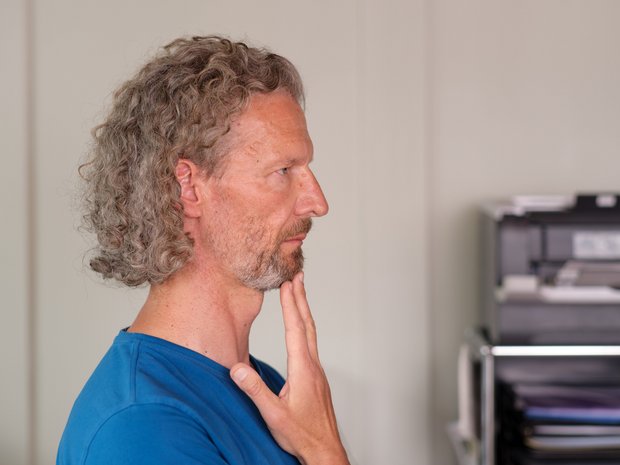 V. (62) erzählte von massiven Nackenverspannungen. Diese zogen sich vom Hinterkopf bis in den Rücken. Wenn die Spannung anhielt, stellten sich gleich auch Kopfschmerzen ein. V. arbeitet mit zwei Bildschirmen und bewegt den Kopf immer innerhalb des gleichen Bewegungsausmasses. Sie sagte, zur Entlastung tue Wärme gut. Schmerzmittel würden ihr aber nicht helfen, und auch die regelmässige Massage wirke nicht nachhaltig.